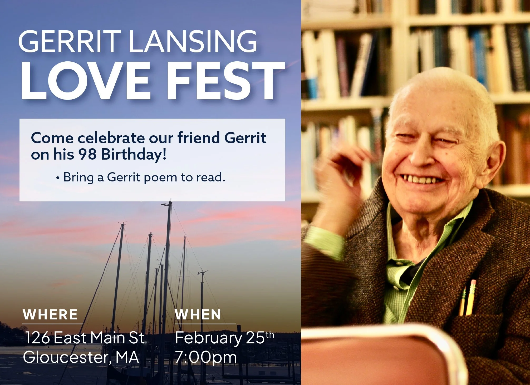 Come celebrate our friend Gerrit on his 98 Birthday at the Gerrit Lansing Love Fest!