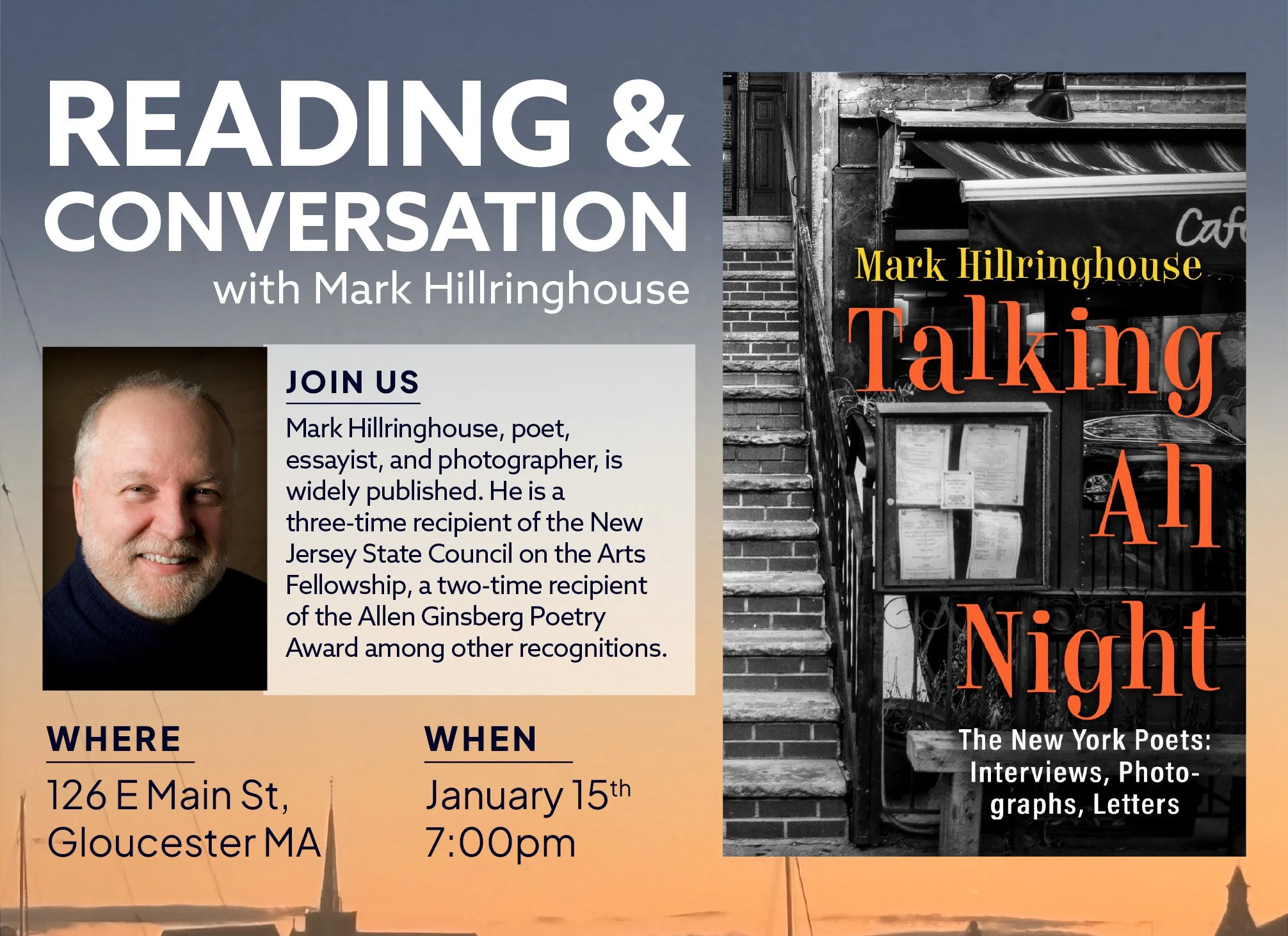 Mark Hillringhouse, poet, essayist, and photographer, has published in The American Poetry Review, The New York Times, The New Jersey Monthly, The Paris Review, and many other publications. He is a three-time recipient of the New Jersey State Council on the Arts Fellowship, a two-time recipient of the Allen Ginsberg Poetry Award (2012, 2024), and a winner of the 2012 National Parks Calendar Photography Contest, among other recognitions. The author of Between the Frames (2012), a highly regarded book blending his poetry and photography, he has exhibited his work in many museums and galleries.